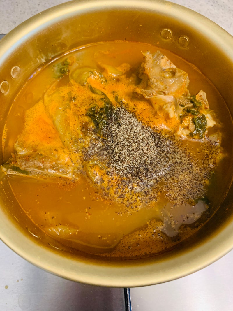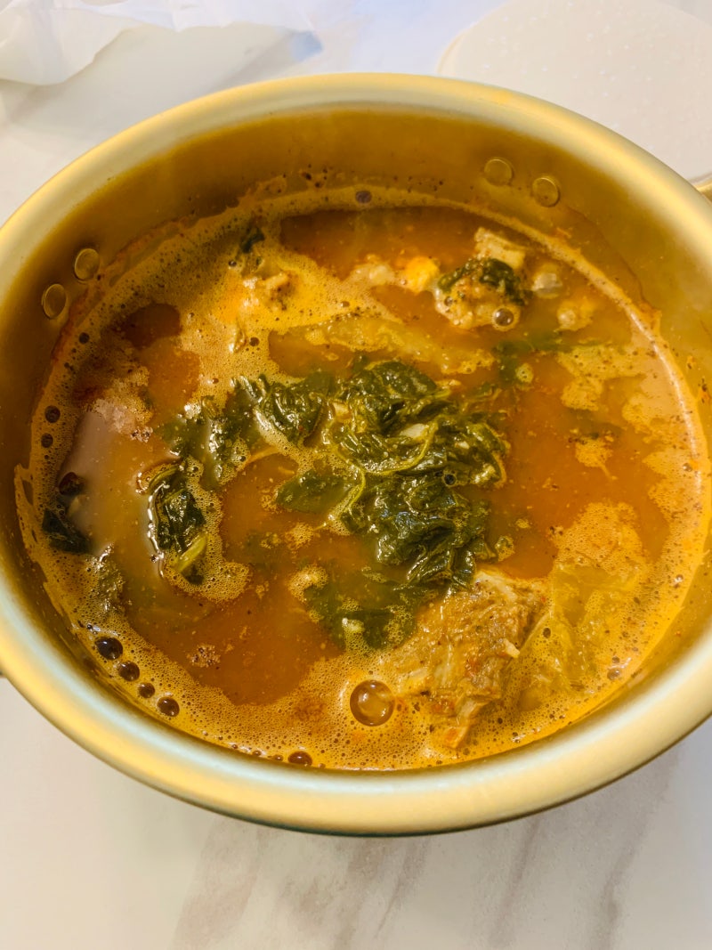 감자탕 맛있게 먹는 법도 자세히 나와 있어요 제대로 먹고 싶어서 냄비에 넣고 보글보글 끓이기로 해요 순한 맛 매운 맛 둘 다 먹어보려고 냄비 2개를 준비했어요. 감자탕을 개봉해서 냄비에 넣고 5분 이상 끓였어요 차가운 상태에서 삶으니까 10분 이상 끓여준 것 같아요 특히 고기를 뜨겁게 먹으려고 냄비 맨 아래에 놓았어요.끓는 동안 파를 송송송 썰어 들깨가루도 준비했습니다.