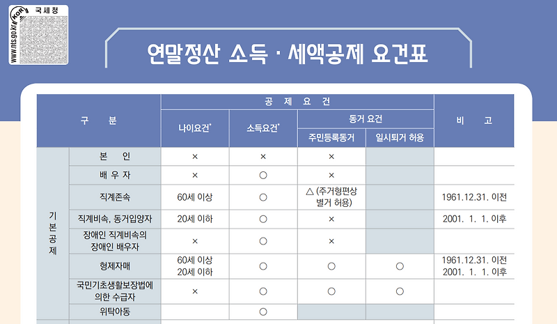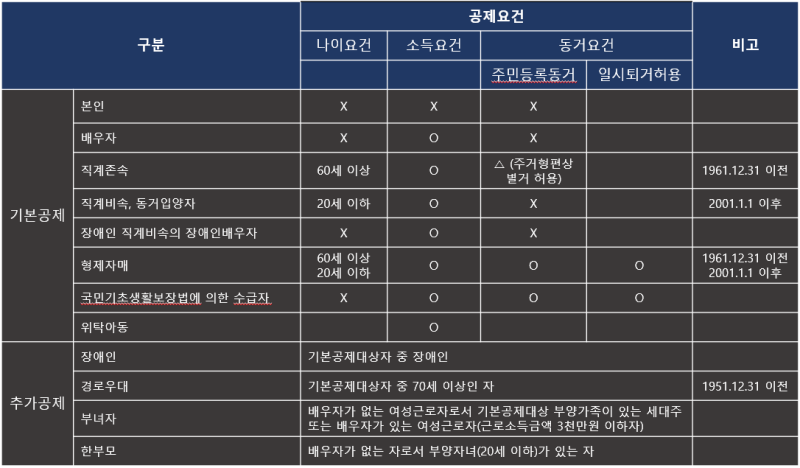 인적공제는 근로자 본인 기본 100만원, 배우자 및 부양가족 1인당 150만원 공제가 됩니다.간단히 말해서 150만원 소득공제를 받는다면 제 총급여(과세표준)가 8800만원~150만원 사이이기 때문에 세율이 35%라면 러프에게 52만5000원×35%인 4600만원이 세이브된다고 생각하시면 됩니다(러프에게) 기본공제와 함께 추가공제가 있습니다.추가 공제부모 또는 조부모가 만 70세 이상일 경우 150만원(인적공제)+100만원(추가공제)하여 250만원이 공제됩니다. 만약 부모나 조부모 중 장애등급이 있는 경우 +200만원과 450만원이 공제되며 인적공제는 부모 또는 조부모 각각!부양가족인적공제요약정리본물론! 모든 부양가족에 대해 인적공제를 실시하고 있는 것은 아닙니다.① 연령요건 ②소득요건 두 가지를 충족해야 합니다.물론! 모든 부양가족에 대해 인적공제를 실시하고 있는 것은 아닙니다.① 연령요건 ②소득요건 두 가지를 충족해야 합니다.인적공제조건(출처:국세청)인적 공제 조건은 크게 연령 요건과 소득 요건이 있습니다.부모의 인적 공제를 끌어내려면 연령 요건과 소득 요건을 모두 채워야 합니다. 나이는 만 60세 이상이 없으면 안 되고, 소득은 연간 소득 금액이 100만원 이하(근로 소득만 있는 경우 총 급여 500만원 이하)이 아니면 안 됩니다.배우자는 연령 요건은 아닌 소득 요건에만 있습니다 그리고 부양 가족 공제지만 주민 등록 상의 동거는 안 하셔도 상관 없습니다. 별거해도 부양할 것으로 보이고! 국세청이라도 주거의 사정 상, 별거해도 인적 공제가 인정된다고 하고 있습니다 그러나 여기서 소득이라는 것을 봐야 합니다. 소득 공제 금액을 뺀 나머지만 계산되므로 단순 소득이 연간 100만원을 넘는다고 공제되지 않는 것은 아닙니다(그러면 범위가 축소돼어요;;)부양 가족 소득 금액의 계산 근로 소득:공제 233만원 연금:공적 연금 416만원을 공제 연금:사적 연금 1,200만원 가능출처 : 국세청부모님이 연금을 받고 있다면 그게 공적연금인지 사적연금인지 알아봐야 해요.예를 들어 노령연금(공적연금)의 경우 연금소득공제에서 416만원이 차감됩니다. 즉, 연간 516만원까지는 연금을 받아도 인적공제로 인출할 수 있는 것입니다(월 43만원을 받는 분까지 인적공제가 가능) 반면 사적연금의 경우는 1200만원까지는 분리과세 됩니다. 즉 사적연금으로 월 100만원씩 연간 1200만원을 받아도 기본공제가 가능합니다.연금소득관련국세청자료부양가족 중복공제 불가능맞벌이 부부가 자녀를 중복 공제하거나 형제자매가 부모를 중복으로 기본공제 받는 것은 불가능합니다.조건이 맞으면 1명만 공제받을 수 있어요.특히 형제자매 간 부모 또는 조부모에 대해 누가 부양가족으로 인적공제를 받을 것인가를 놓고 다투는 경우가 많은데…. 일단 동거 여부는 상관없습니다. (따로 살아도 인적공제 가능) 주민등록상 혹은 실제 동거하지 않아도 부양가족 인적공제가 가능하며 형제자매간 분쟁이 발생한 경우 실제로 부양하는 사람 혹은 동거하는 사람이 부양하는 것으로 간주됩니다.즉, 동거하고 있는 형제자매가 공제를 받을 수 있다는 것입니다.말도 많고 트러블도 많은 연말정산···특히 소득공제를 조금 적게 받거나 세액공제를 받지 못하는 경우 많게는 400~500만원씩 추가 납부(토하는) 경우가 많습니다.부디 22년 연말정산(21년 귀속)에는 소득공제와 세액공제를 잘해 절세하시기 바랍니다:D말도 많고 트러블도 많은 연말정산···특히 소득공제를 조금 적게 받거나 세액공제를 받지 못하는 경우 많게는 400~500만원씩 추가 납부(토하는) 경우가 많습니다.부디 22년 연말정산(21년 귀속)에는 소득공제와 세액공제를 잘해 절세하시기 바랍니다:D